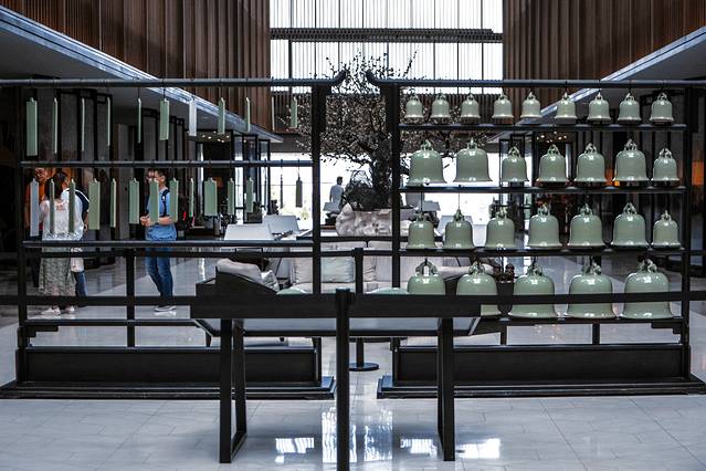每周五、周六、周日下午五点半时分,便有一场专人的演奏。如果有时间的话,不妨来这里,听一曲清脆悦耳的青瓷瓯乐,悠悠古乐,静心享听,与酒店的古朴之气遥相呼应,仿若带你穿越到旧时的金陵繁盛之中。
