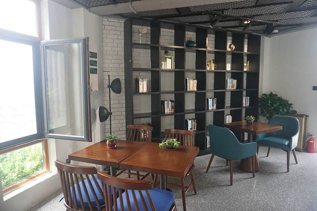 再往前走,就是悬崖书吧。进了室内,周身燥热顿时一轻。舒缓的轻音乐流进耳朵,是《someone you loved》,日光透过落地窗无遮无拦的投在木桌、木椅、桌上的绿植和书架上,落在英伦风的古画和沁人的冰饮上。从落地窗看出去,是一片水质清澈的海湾。