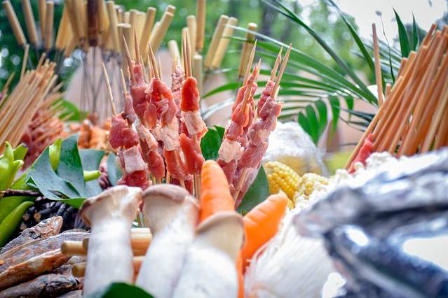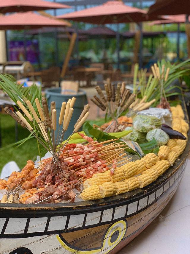 不仅仅是篝火,晚会有唱歌、跳舞、更有可爱的公仔和你打招呼,合影。客人们围绕着篝火而坐,配以自助烧烤,各式美食。牛肉串、猪肉串、五花肉……新鲜蔬菜和肉食应有尽有!满足你吃货的胃!当冰爽的啤酒倒入晶莹的酒杯,酒精加麦芽的香气,让你只想一饮而尽。在这个季节,还有什么是一顿烧烤不能解决的?现场更有椰子、特色饮品售卖,清凉的饮品入喉,一秒穿越至东南亚!