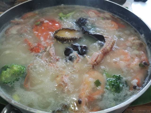 前两天吃的有点横,今晚稍微清淡一点。来一大锅海鲜粥🥣
