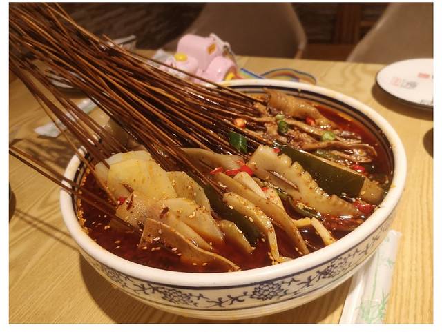 传统的钵钵鸡的汤底是用鸡骨架熬的高汤调味而成的,所以叫钵钵鸡。“古真记钵钵鸡”的冷锅钵钵鸡,就是那种完美的钵钵鸡,汤底香、食材新鲜、种类多、价格便宜。