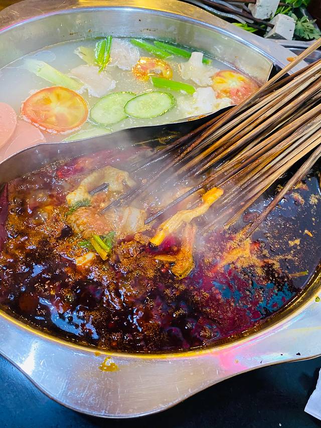 顺着较场口夜市,我们沿着马路找到了一家人气超高的江二娃串串🍢,店铺不是很大,环境一般~但是很多当地人都在吃,肯定不会太差,我们也很快进去落座!老板一眼看穿我们是游客,说:你们来个鸳鸯锅,微辣就可以了😂😂(内心os:我明明吃辣还可以的😿),但是小伙伴和我都需要适应一下,我们欣然接受!