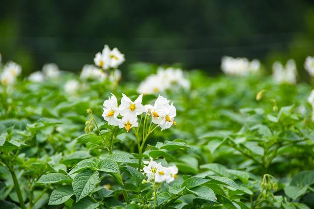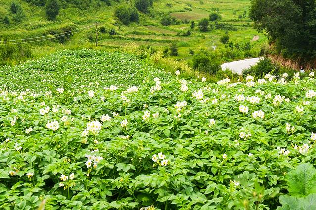 路边的菜地种的是土豆,正值土豆花开的季节,一片片雪白中点缀着黄是花蕊
