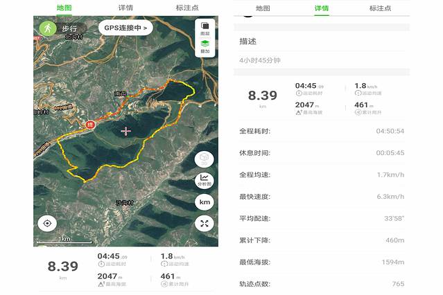 小环穿徒步8.39公里,用时4小时50分钟,最高海拔2047米,最低海拔1594米。