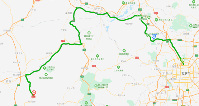 从北京出发到张家口蔚县麻田岭,距离262公里,7:15集合出发,10:55到达。经G6京藏高速-G7京新高速-京礼高速,再上G6京藏高速,转G95首都环线,再转S36太行山高速,西合营出口下高速,走G112一路向南,即刻达麻田岭,车停路边空地即可。