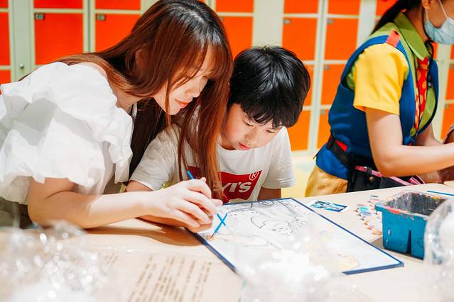二楼还有专为宝妈准备的美甲室,遛娃的同时还可以在这里享受免费美甲,非常贴心。可惜太过火爆,一直没排上。于是和龙龙到边上的亲子手工室,一起完成了一副别具纪念意义的作品。