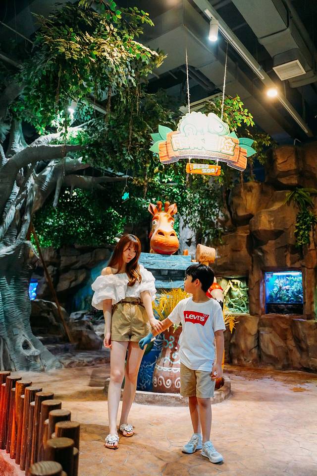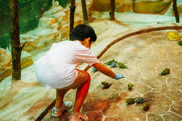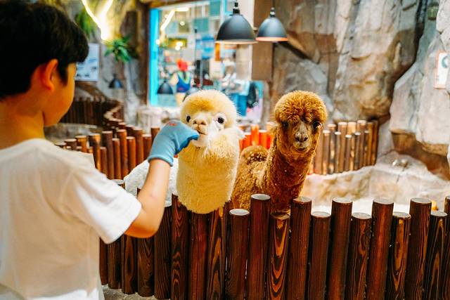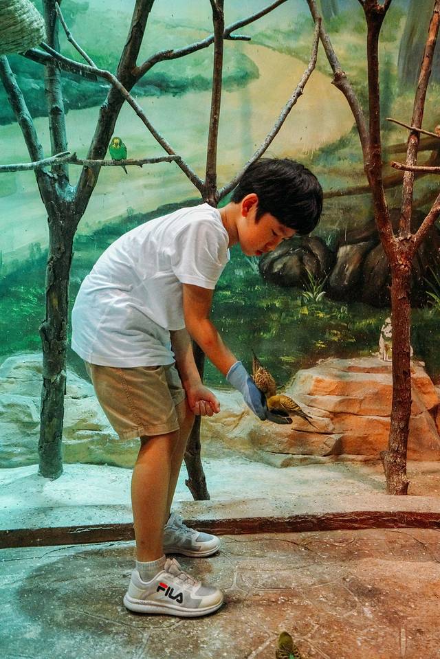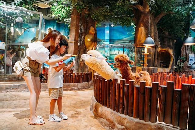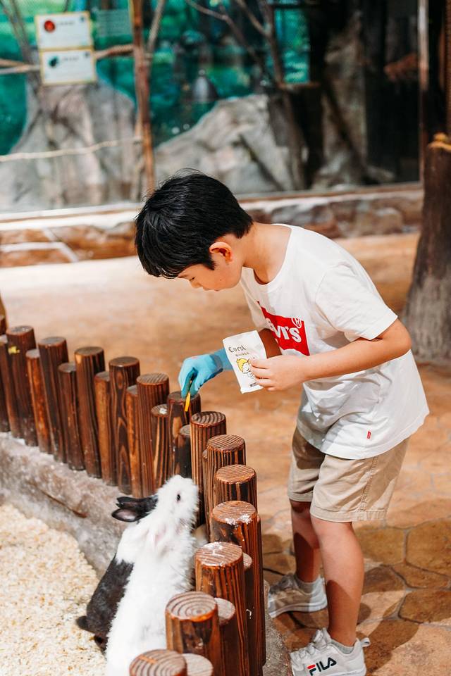 热身完毕,一群萌萌的小动物将龙龙吸引了过去。整个萌宠乐园好似一片森林,里面可以和小动物们零距离接触,戴上手套,可以抚摸小动物们,给它们喂食。