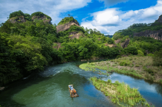 在水流盘曲的九曲溪,泛舟戏水
