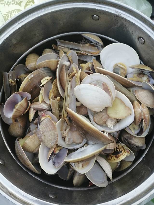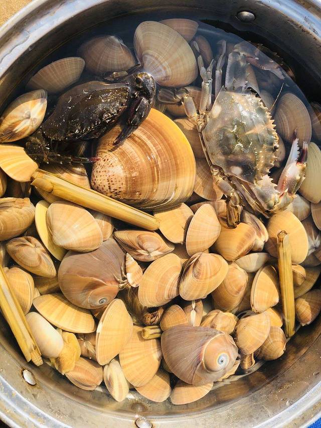 蛏子,螃蟹,蛤,猫眼罗,寄居蟹(侄子们抓着玩的,不能吃)满满一锅!