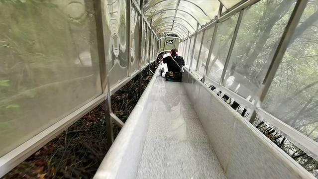 高空滑索在溜溜滑道的下一站。滑索共分为两道,第一道长350米,落差78米;第二道长200米,落差60米,两股滑道如两条白练悬挂于两山之间,顺着山体的坡度划出漂亮的弧线。上滑索之前会有安全员测量体重用以调整设备的速度,我因为重量不够还在身后的背囊里加了个沙袋,身上所有的物品包括帽子都要放在背囊里确保不会掉进山涧。准备工作做好以后,坐上滑索的木凳,张开双臂,纵声尖叫吧。