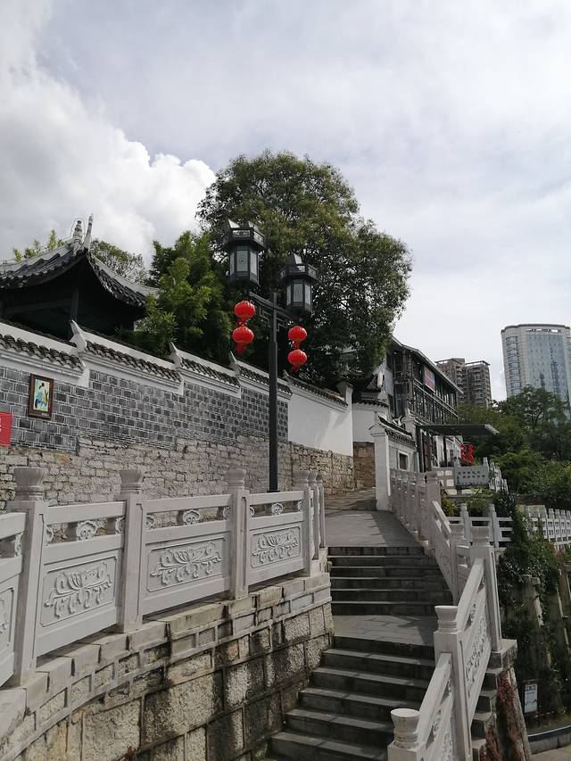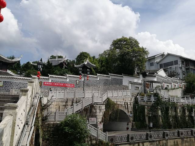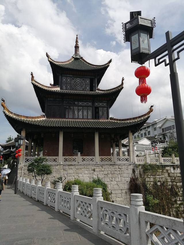 甲秀楼上下三层,白石围栏,层层进收,桥面到楼顶能有20来米高。