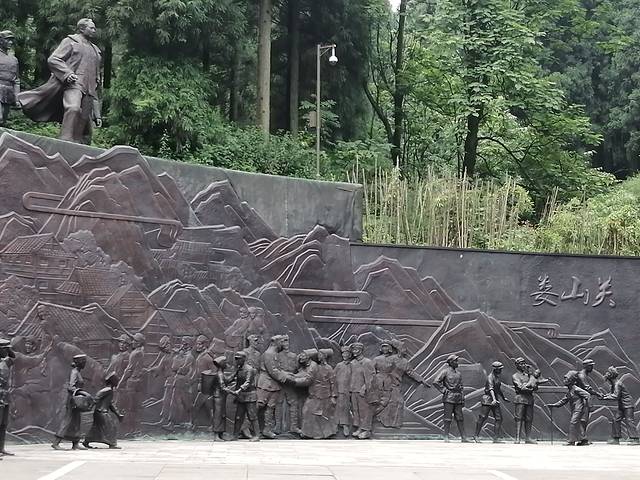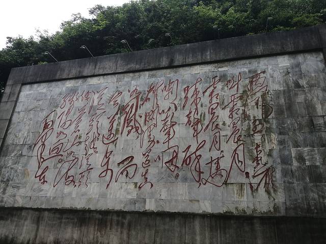 连日降雨导致通过西风台的路封闭了,景区车只能停到娄山关口的山脚下。带着遗憾下了车,在川黔公路边看到一幅大型的浮雕,全景反映娄山关战役全貌。