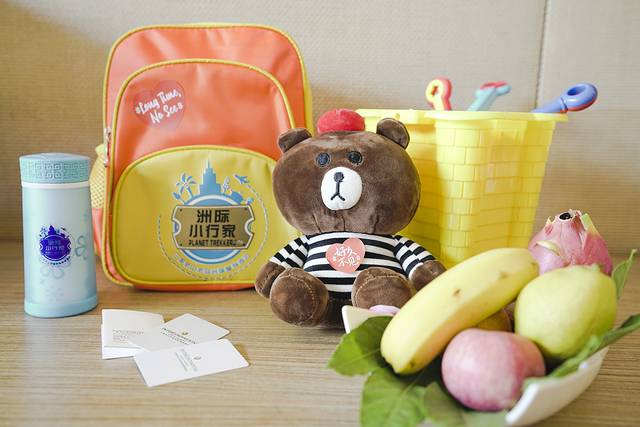 酒店知道我们带小朋友入住,竟然贴心准备了“洲际小行家”的小书包、小水杯、海滩挖沙工具、小熊和水果,齐全到惊喜~这里要说到“洲际小行家”,这是酒店一个专为小朋友建造的儿童乐园,每天开放,有智趣活动可以参与,还有看护人员帮忙照顾小孩。