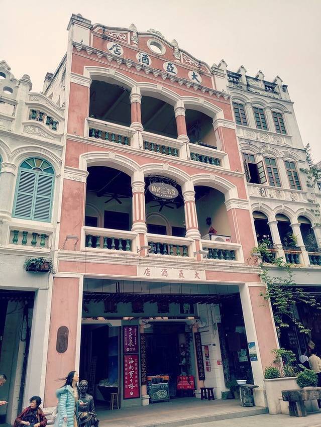 这家酒店还是很出名的,现如今的大亚酒店老板其实早已经搬迁到 海口 的其他地方,这座建筑是在翻新过程中依照百年前的大亚酒店建筑风格模拟重新做的巴 洛克 风格的酒店,原酒店投资人是个 马来西亚 的华侨,原酒店分为三层,这里一层已经看不到了,在民国时期是裕隆商城,民国时期 海口 最繁华的商城之一,二楼三楼才是大亚酒店,如今此条街的改造也按照原貌恢复了曾经的模样,但总觉得缺少一点什么。