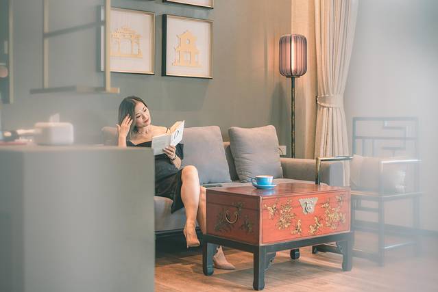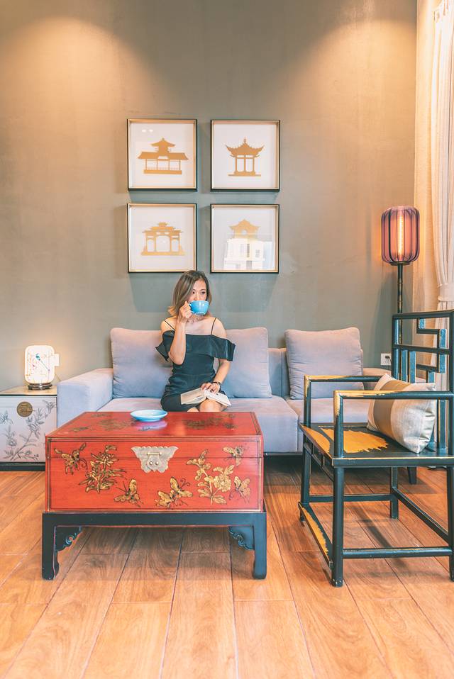 我们的房间叫西塘,这间以江南水乡命名的房间是间充满新中式品味的套房,卧室和客厅相连,望园林的大露台,兼顾了私密和风景。
