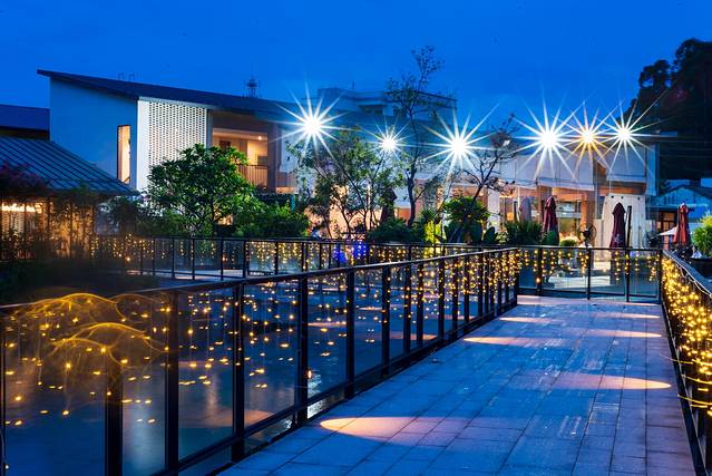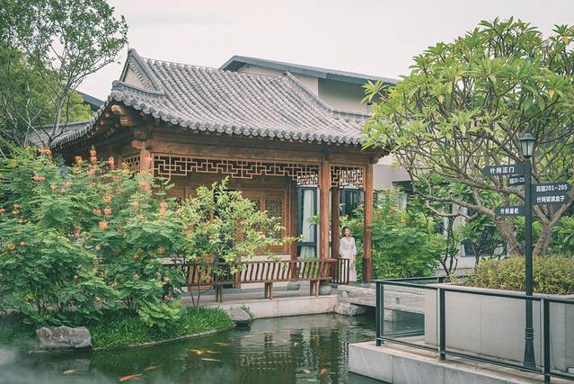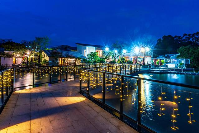 什间的夜是律动的,沿着九曲桥穿过湖面,那随风轻摆的小灯,仿佛夜空中闪烁的星。