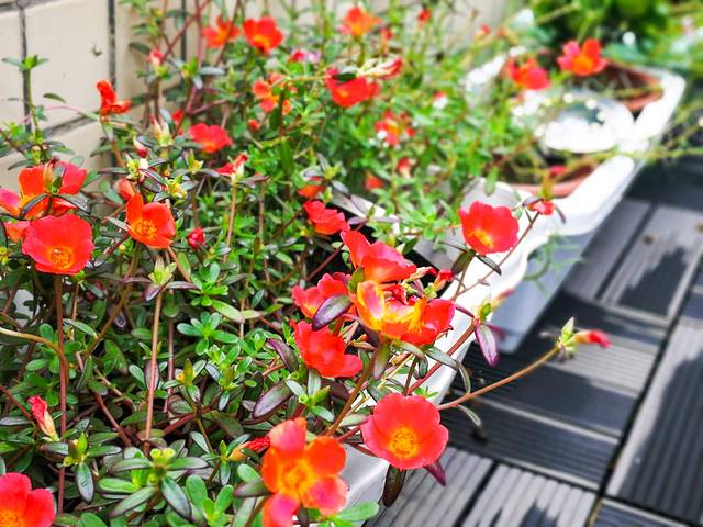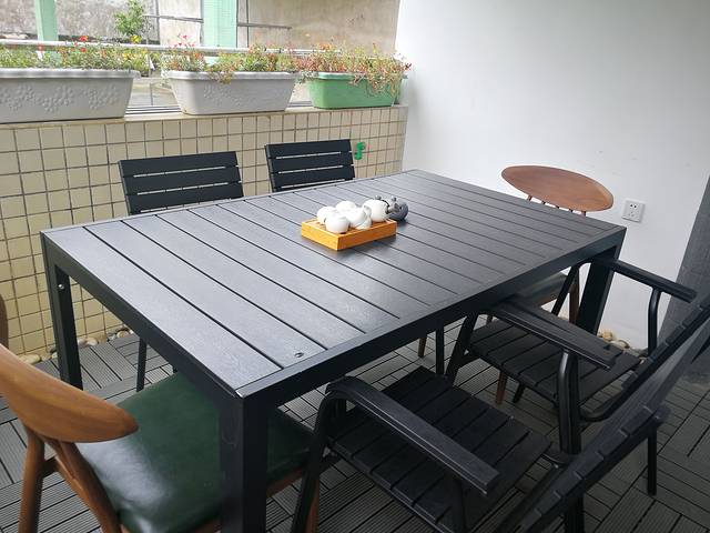 我最喜欢这里楼顶的露天花园阳台,铺着条纹木质地板,和桌椅的质地颜色一致,墙角边散落大小不一的鹅卵石镶嵌其中,和周围的花草相映成趣。