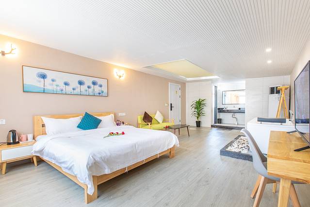 旁边是一个带浴缸的阳光大床房,空间非常大,拉开天花板上的百叶帘,阳光倾泻而下,自带消毒功能。