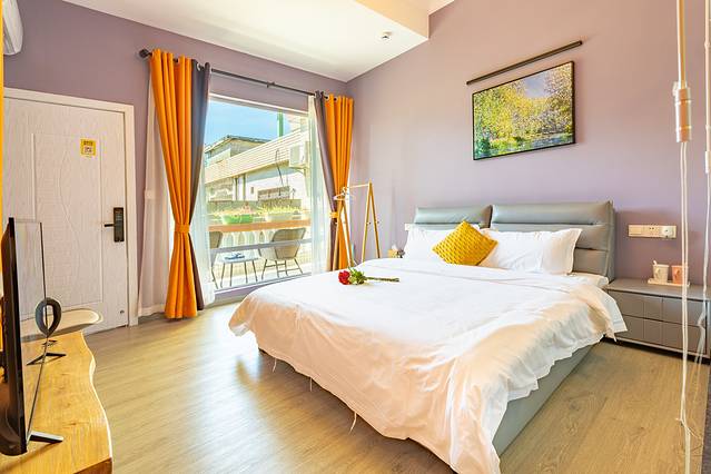 背后的大床房与阳台相连,落地窗相隔,从房间内看出来,心情无比舒畅。