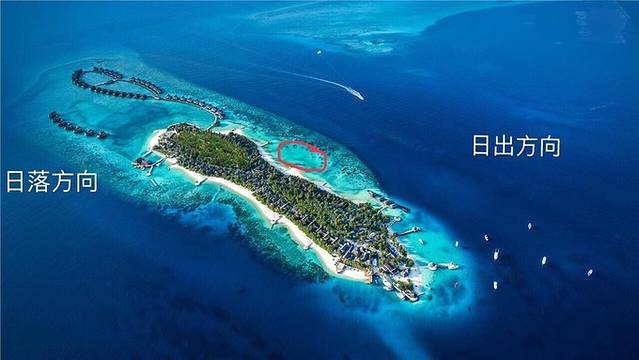 日出方向岛中部这片区域(下图红圈儿),因为离珊瑚礁远一些,泻湖稍微大一点儿,所以沙屋前海水颜色比较漂亮。日落沙屋离珊瑚礁比较近,个人感觉海水颜色不如日出这边。下图是借用官方俯瞰图,可以清楚看出泻湖区域和珊瑚礁区域,能看出我圈出来的日出沙屋中段泻湖比较大一点儿,而日落沙屋方向几乎没有泻湖。
