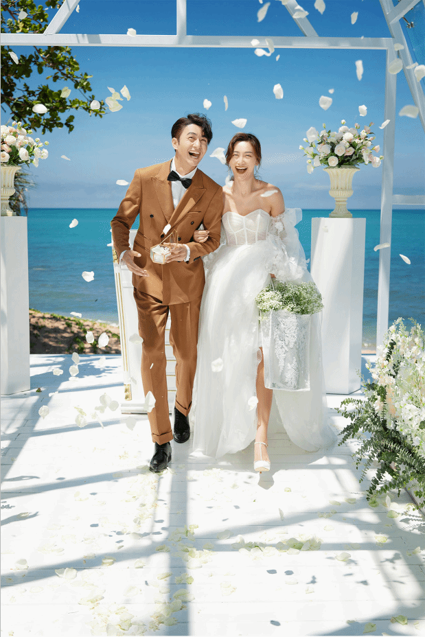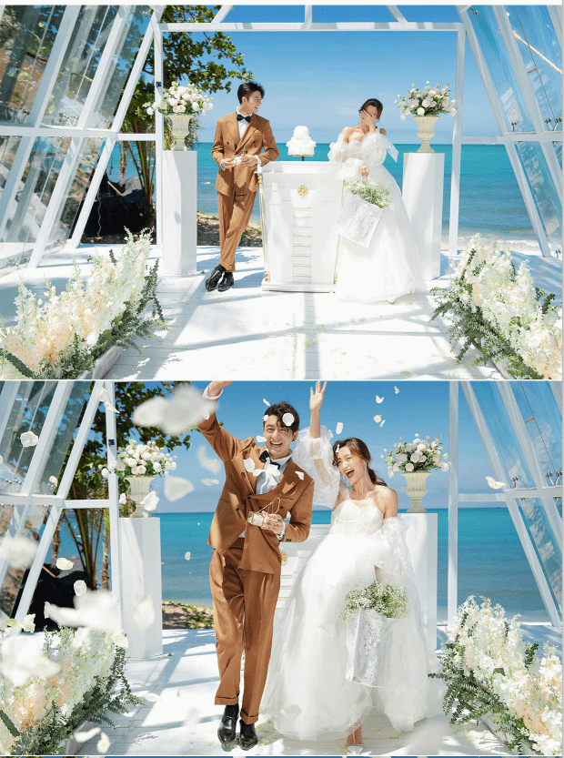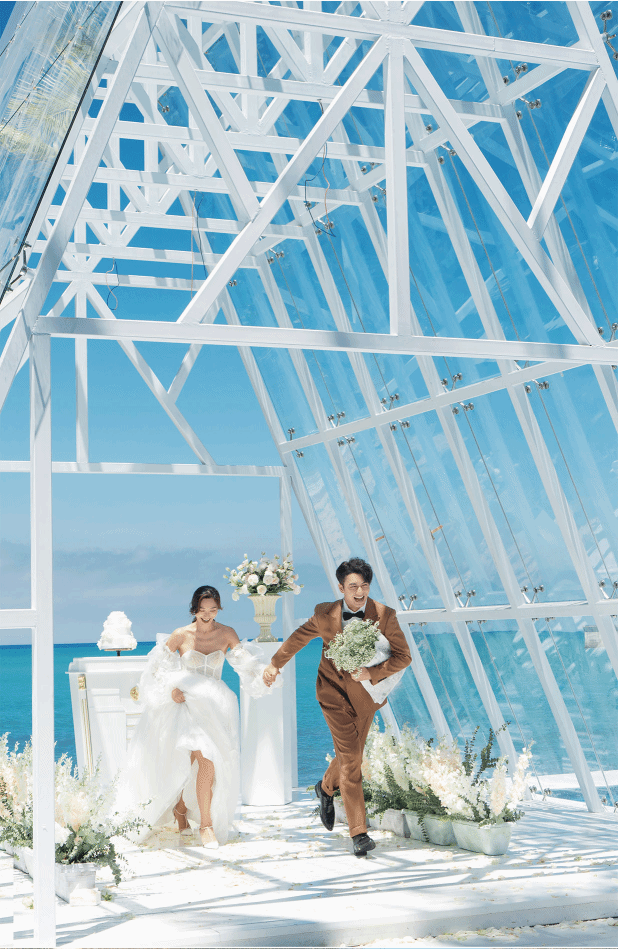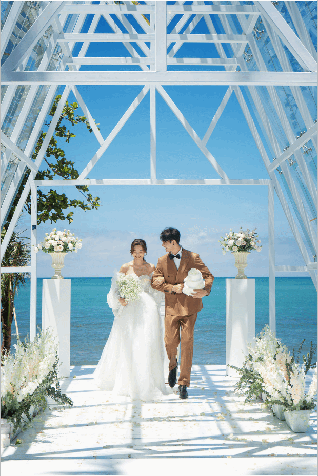 最美水晶教堂 外观采用透明玻璃和全白钢架搭建而成,玻璃外墙的水晶教堂背景非常通透,阳光可以通过玻璃照进教堂,折射出多彩的光,教堂内的设备以白色为主:白色的礼台,白色的木质宾客椅,透明的玻璃仪式台,再用鲜花衬托,再与四周茂密山景交相呼应,透过玻璃是美丽的滨海城市全景,伴着山顶清新,美好,浪漫的气息,用这一切的美好来见证世间最美好的事。