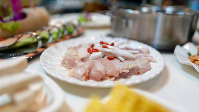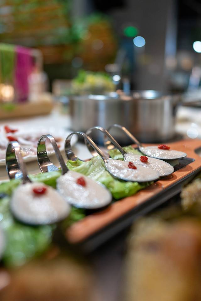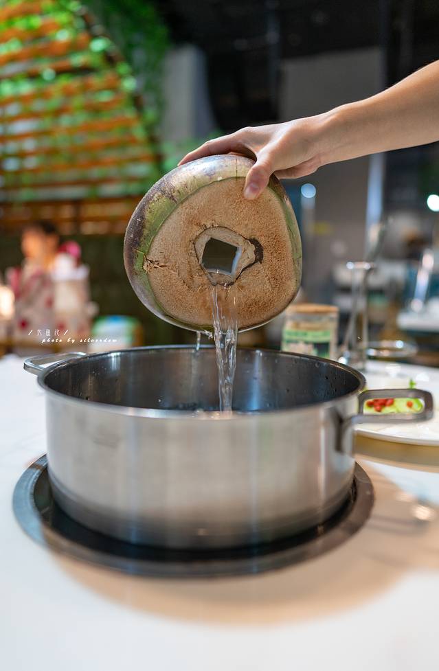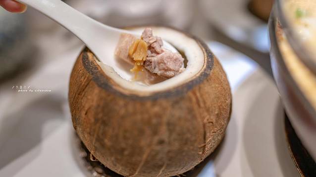 这里的秘制蘸料超级棒,可自己调料,可以工作人员帮忙调配,不过还是建议工作人员帮忙调配,因为我自己调过一次,简直是惨不忍睹。下面就是我们垂涎已久的椰子鸡登场啦,椰子鸡的底料全部由刚才在门口砍开的椰子作为底料,三个超大的的椰子水倒入锅中,加入了海椰皇、枸杞、马蹄等食材一起熬煮,香甜可口。