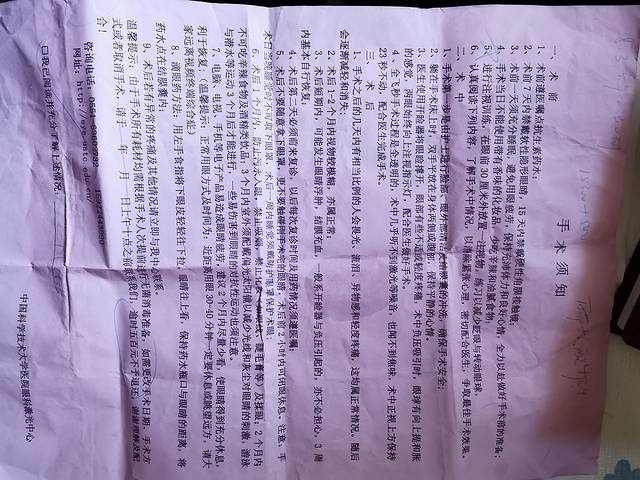 在手术室的外面焦急等待。看着他们做过出来,有的一只眼睛打着绷带,还有戴着咸蛋超人的眼罩,心里觉得好紧张。在等了一阵子以后,就到我了。进入手术室先穿上手术服,护士小姐姐就给双眼清洗、消毒。接着就进入手术室。手术的医生很幽默,会给你找话题,让你尽量放松。就只觉得眼睛前面的绿点出现消失,医生用的不知道什么东西给你扒拉扒拉。整个收拾就结束了。在等出去的时候,会给你带上眼罩。
