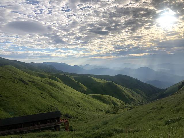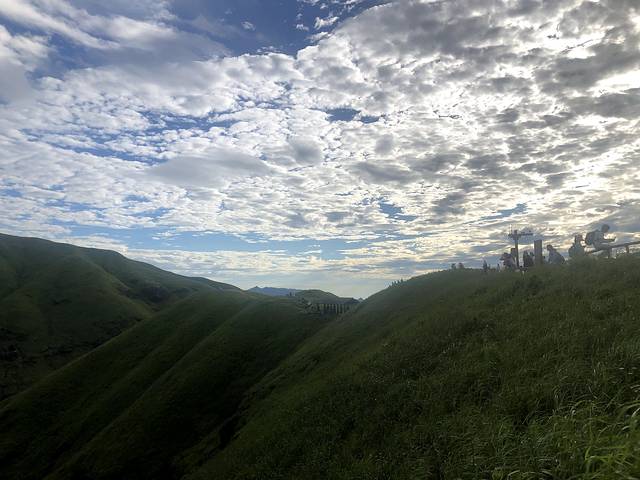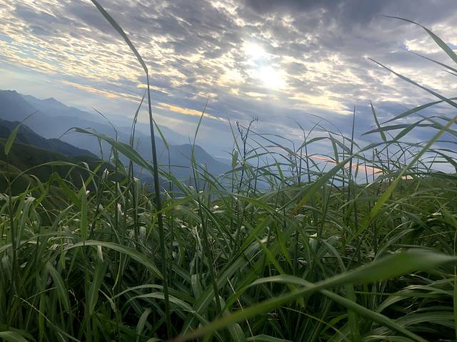 上山的路曲折蜿蜒,爬过第一个山头,山顶出现了很多草甸,像是高山上的草原,长叶碧绿舒展,油亮耀眼,想牵一匹马来策马奔腾。在太阳的照耀下,深绿变成了浅绿,