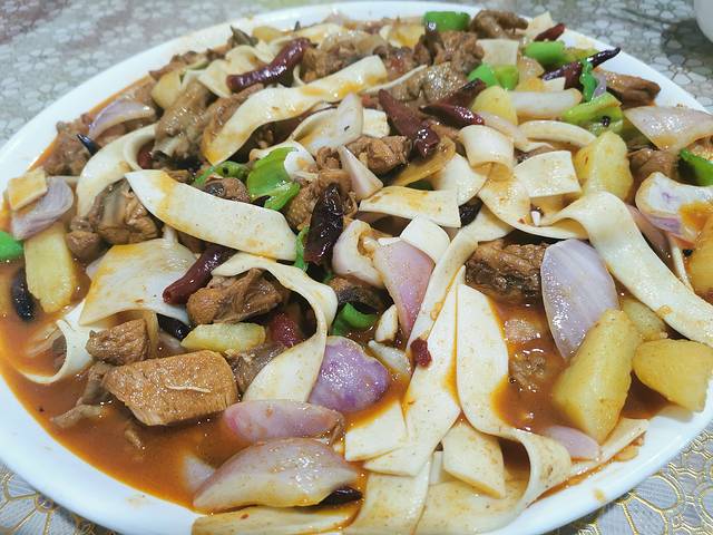 晚饭时间比较晚,和同行的小姐姐还有她的母上大人一起AA吃了当地特色大盘鸡🥩(怀念大学时期,这个比那时候的味道更好吃,更正宗),还有特色菜~名曰沙葱炒鸡蛋💞💞推荐小伙伴一定要几人同行,这样才可以让胃填得满满的🍜🍜🍜