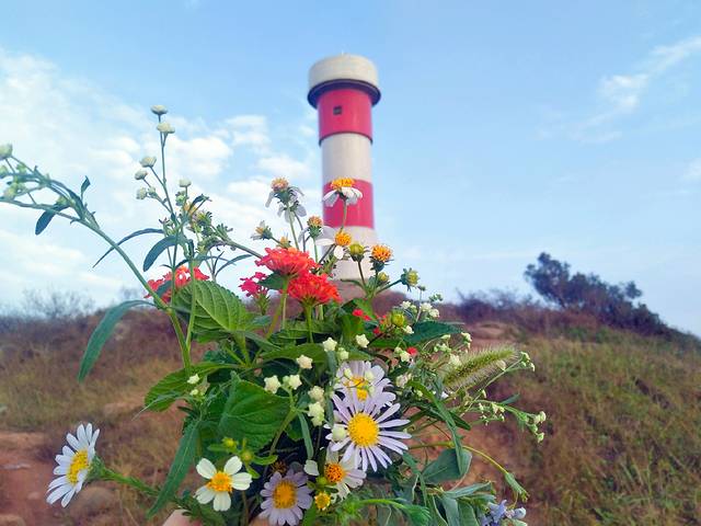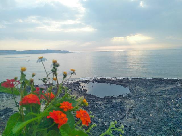看完日出,我们沿着山坡上的一条小路往前走,这条小路是无意中发现的,估计很多游客都没注意到,大家一般都是走小树林过去。在小路上走着,可以看到整个海,以及海边的火山岩;一路上有很多小花,就随手摘了一束花。