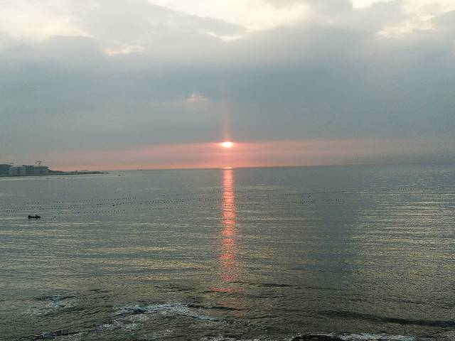 为了在镇海角看日出,我们早上五点钟出发,走到镇海角的一个山坡上,坐在山坡上等日出。五点四十分,太阳慢慢出来了,只可惜有一小片云把太阳挡住,不能看到整个完整的日出。