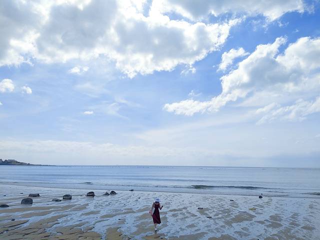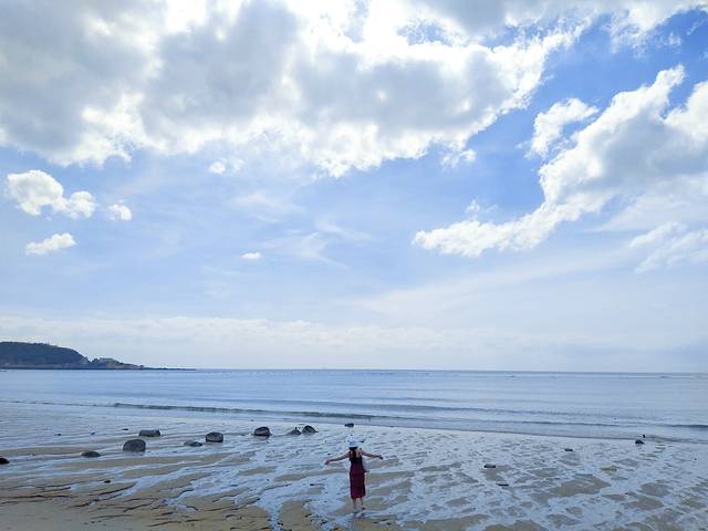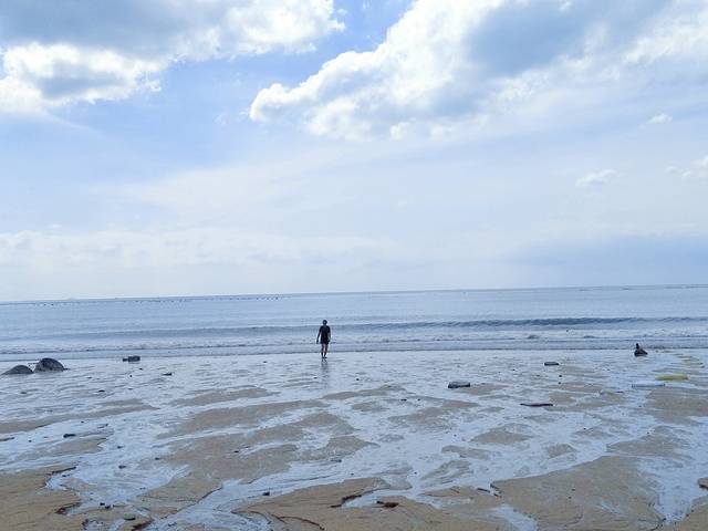 从小树林往前就是情人湾沙滩和无边泳池,但是无边泳池还在修缮没有开放,所以就没去了。我们往下走到了沙滩上。可能是因为很早,沙滩基本没有什么游客,只有一些当地人的身影。脚踩沙滩,面朝大海,有一种海阔天空、无边无际的感觉。