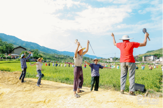上午刚到活动举办地东升村,一望无垠的稻田闪耀着金色的光芒,四面青山环绕,村民和游客一起围聚在田埂上,共同期待丰收时刻的到来。这幅唯美的生态乡村画卷让人如痴如醉,颇有几分陶彭泽诗中,“暧暧远人村,依依墟里烟。狗吠深巷中,鸡鸣桑树颠”的气息。