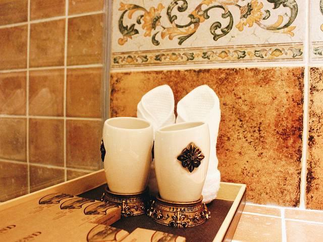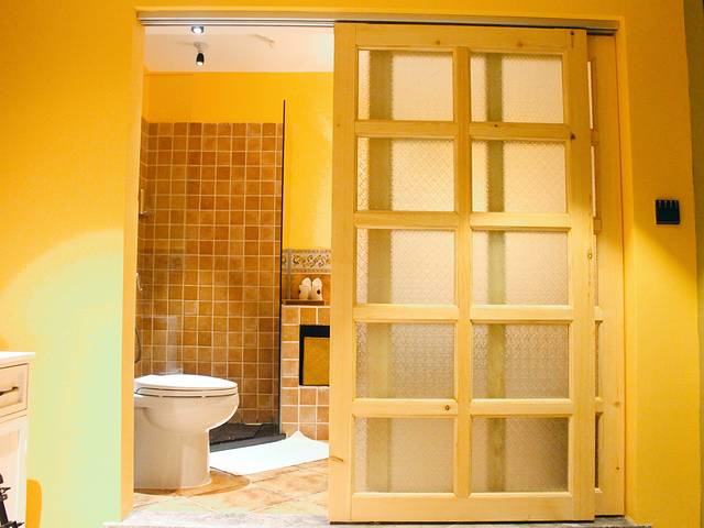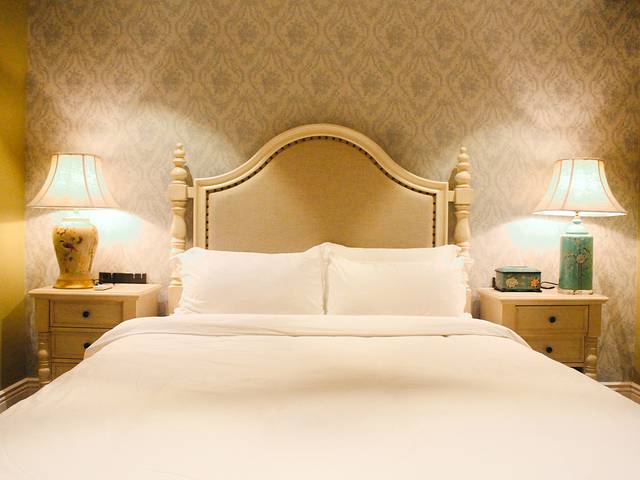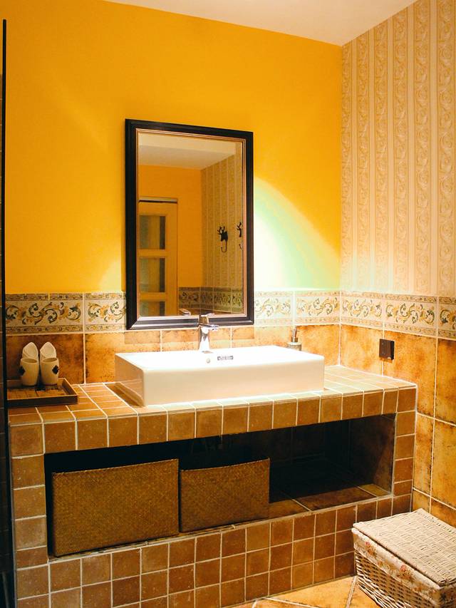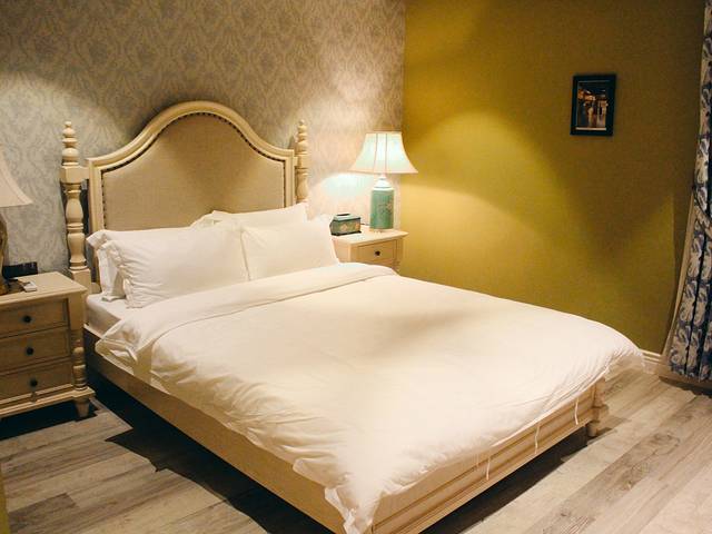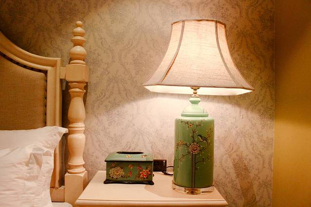 木质的大床、桌柜,雅致的台灯、墙纸,铜质的落地灯,所有的一切都恰到好处地营造出一种复古小调,就连洗手间也是复古风。
