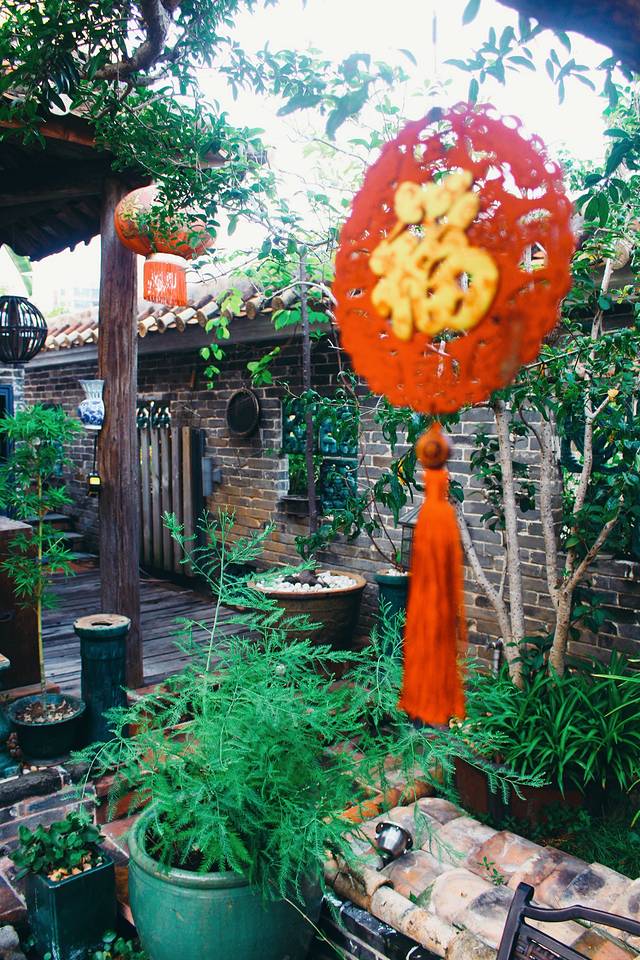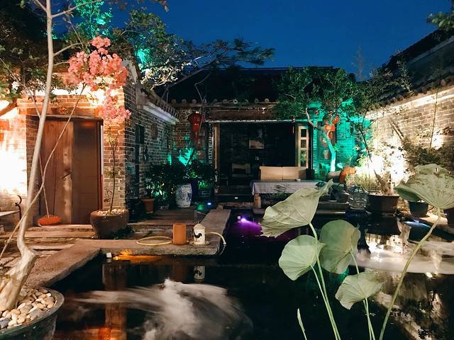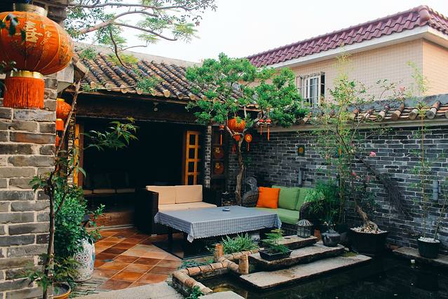 民宿5楼是天台花园和茶室,红砖灰墙,清池碧叶,各种花花草草点缀其间,独具岭南园林特色。