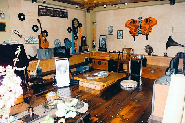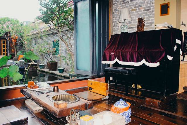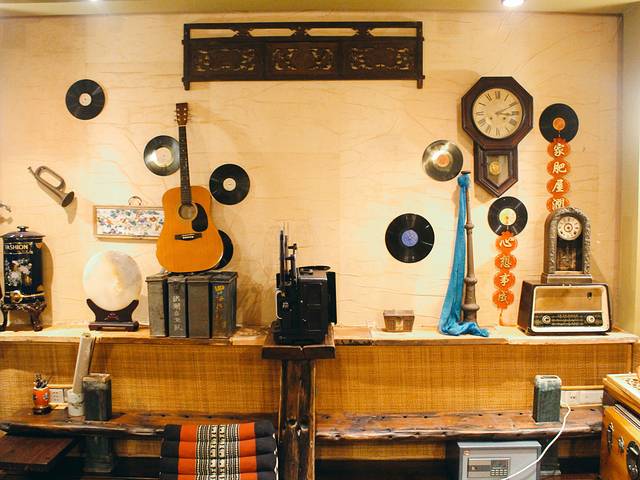 民宿主人一定是位极其喜爱收藏各种老物件的人,茶室同样摆放了各种复古物件,留声机、老式挂钟、吉他、挂在墙上装饰的唱片……甚至还有一架钢琴。