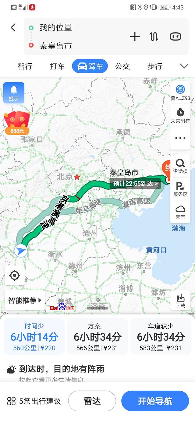 中午十二点从国际庄家里出发,带着媳妇儿和简单的衣物以及复杂的饮品(白茶,普洱,农夫,烧水壶,保温壶,喝水杯),上午先从大众点评上选了一家宾馆,滨海蓝天商务酒店,预订两晚141元一晚,跟着导航一路北上京港澳高速----首都环线高速----京哈高速----京哈高速北戴河支线----剑秋路----联丰路----海宁路----目的地。