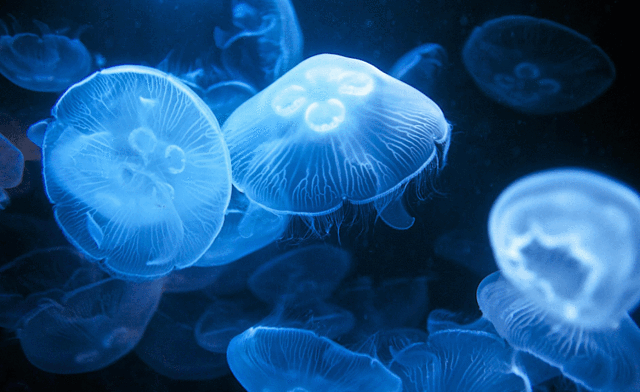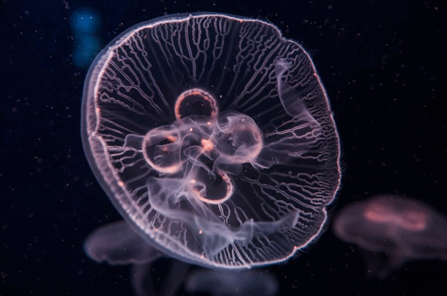 我们能看到五种姿态各不相同的水母在水里悠闲漂浮