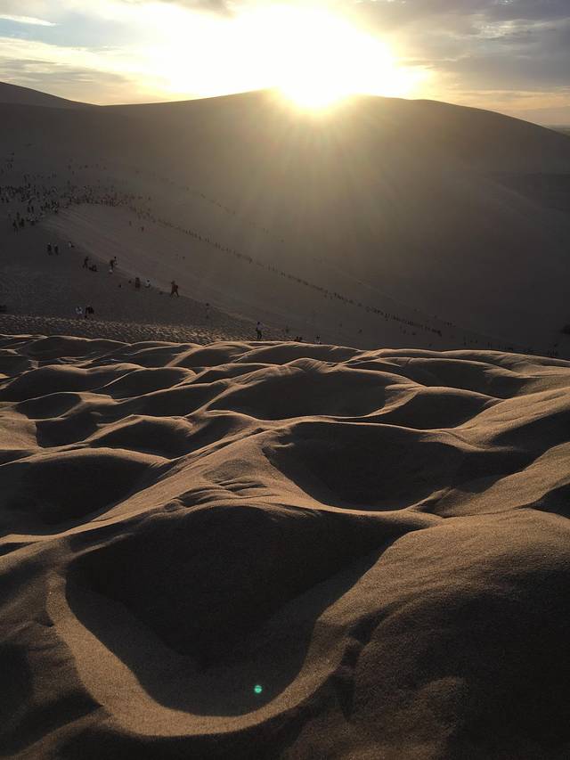 鸣沙山有骑骆驼(100元)、滑翔伞(360元)、热气球(好像也是360元)、滑沙(好像是30元),可根据需求选择,进去可自由选择是否乘坐车子,一般都会坐,来回20元需另外购票。