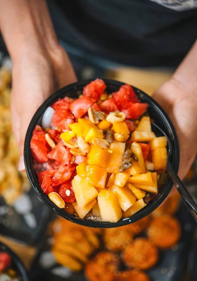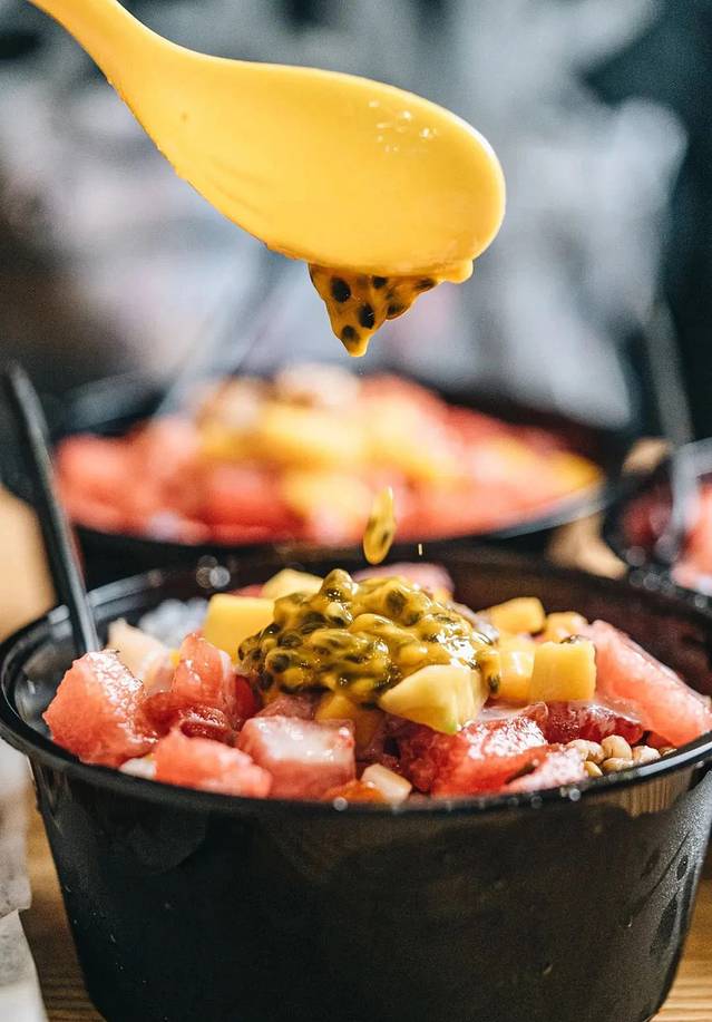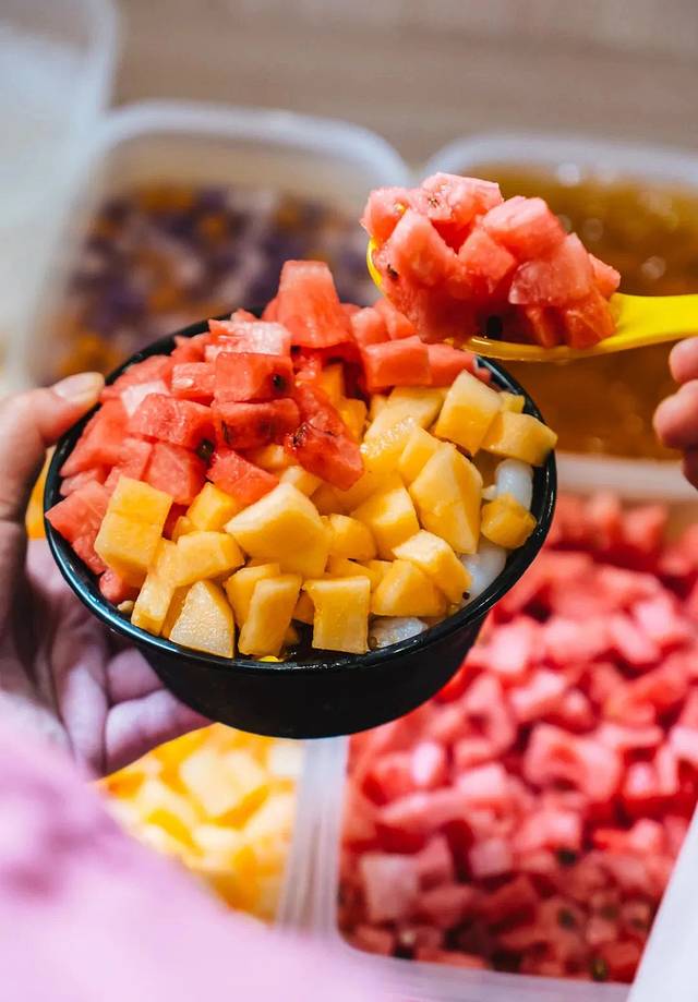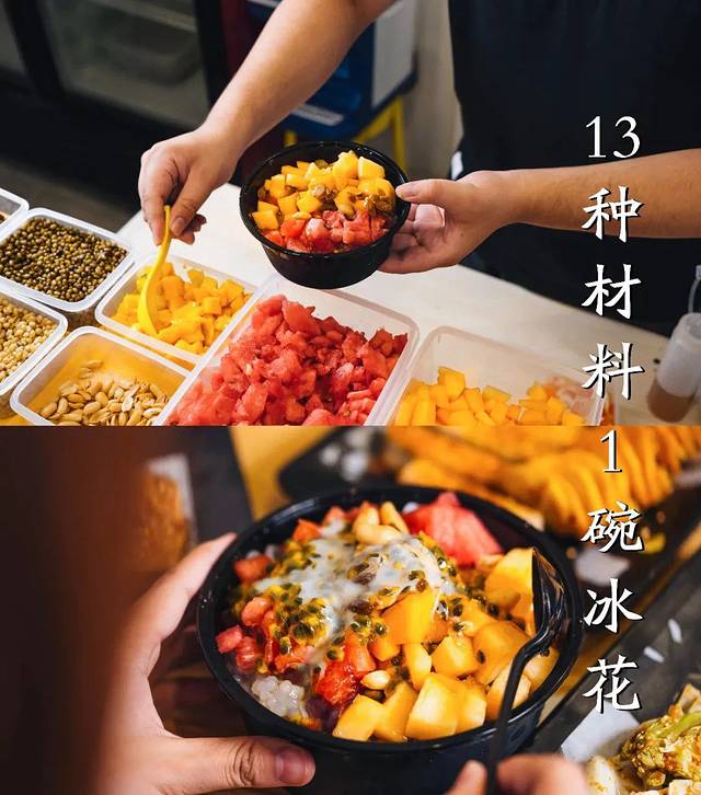 甜甜的牛奶味搭配上芒果'西瓜'哈密瓜等水果'绿豆,小麦,等十几种配料。拌着底下细碎的沙冰'这个夏天真的好值得