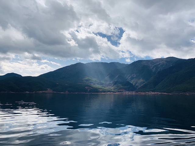 返程途中看到了直升机取水,船夫说可能附近的某片森林着火了,冬天干燥,容易引发森林火灾,不过这操作是首见。还看到了丁达尔效应,阳光穿过云隙轻抚湖面。