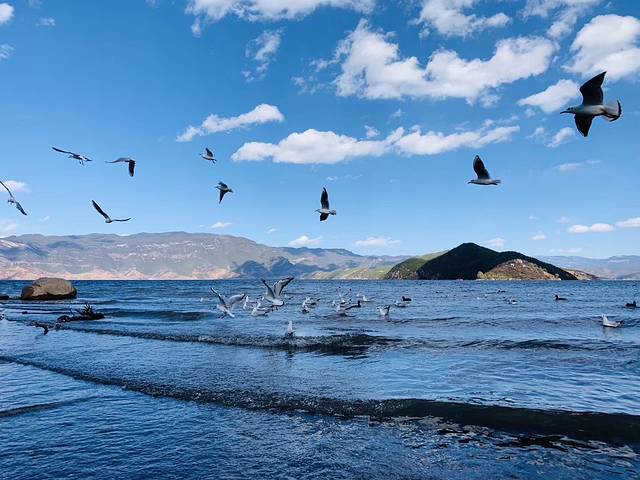 从丽江进去那面的泸沽湖好像有两个村庄,离得不远,木栈道走15分钟就能到,我们住在大落水村,据司机说是这里最大的村庄了,吃饭和住宿的比较多,我们就住在公路旁,前面也没有任何的遮挡物,从房间的落地窗就能看到湖水,我们在里面住了2天,每次就从前面的那块苹果基地穿过去就到了湖边,看群群海鸥翱翔觅食