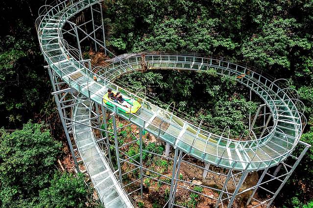 7分钟到谷底全程高速,如同穿越星空隧道一般,随时可让你体验到“飞一般的感觉”,这个项目老人孩子都适合,全长600米、落差155米,犹如鹰隼盘旋大地。从山顶往下滑