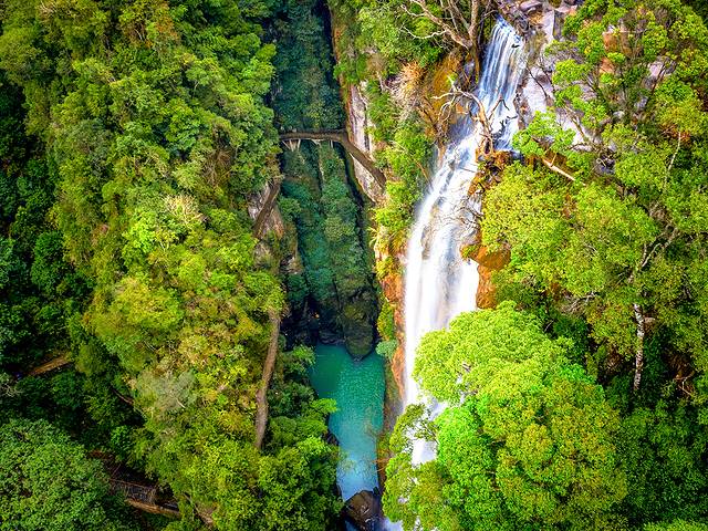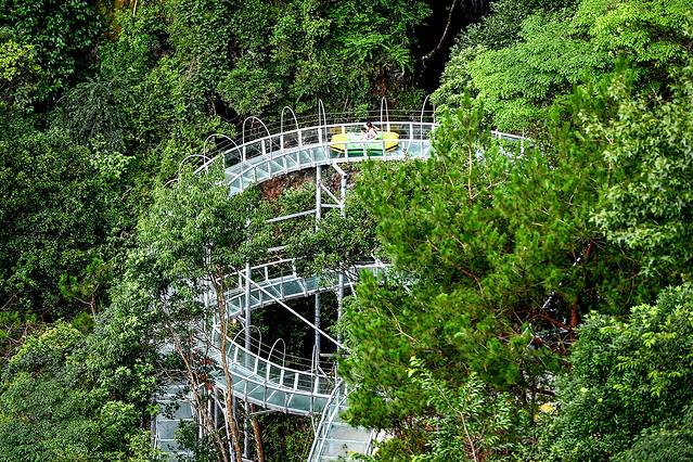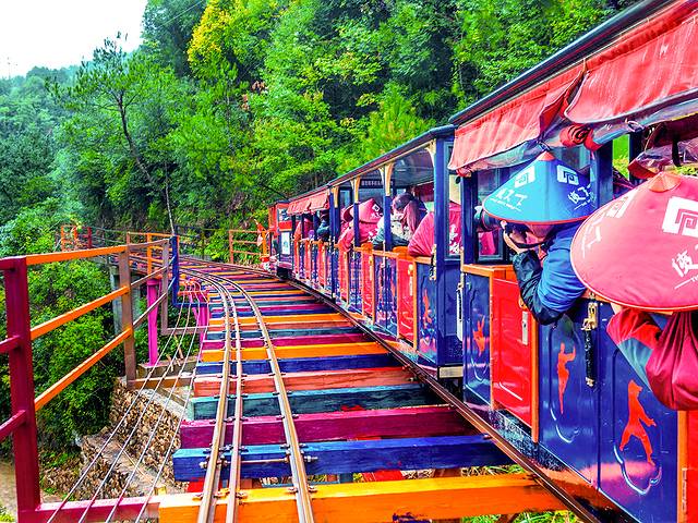 贯穿侠谷景区的丛林火车,是一幅美不胜收的景。全程3公里,最高处离地将近30米,盘旋于峭壁之上,穿百米高崖,钻万亩密林,是可以极大地减少“脚程”,以最快的速度抵达绿林景区入口处。