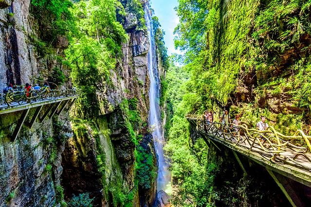 落差近200米的“鹰嘴彩瀑”,远看宏伟雄壮,近观是水雾梦幻。每当朝阳升起时,巨瀑飞沫如散珠喷雾,日光烛之,幻化成虹,夺目璀璨。