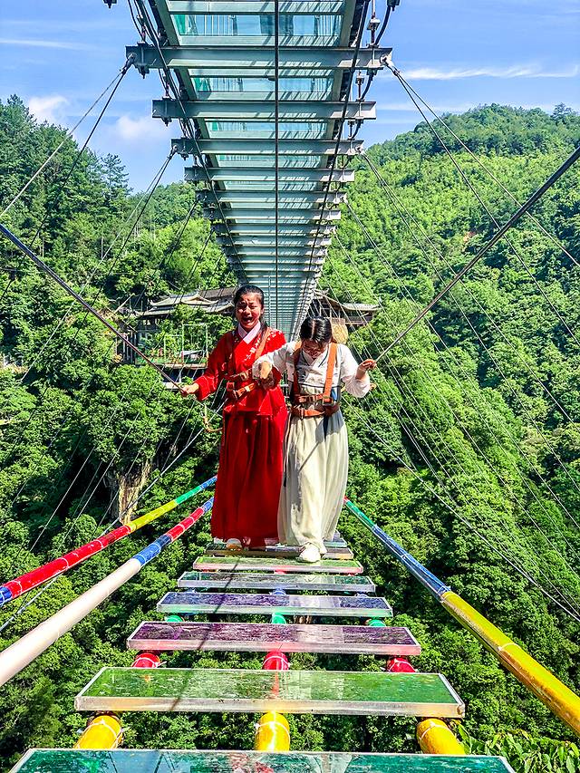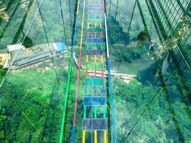 侠天下旅游区玻璃天桥,空于险峻峡谷中,下方就是原始森林,边上是近300米高的老鹰瀑布,整座桥长近300米,宽2米,高近200米,相当于70层機高,走在玻璃天桥,如同空中漫步,云天气时,走入跨山穿越,雨、云综绕的天桥,仿佛进入仙境犹如天外飞仙腾云驾;晴天时,站在玻璃天桥上课俯先天下録林全景,一览众山小,看飞流直下三千里,观瀑布底下武林大会刀光剑影