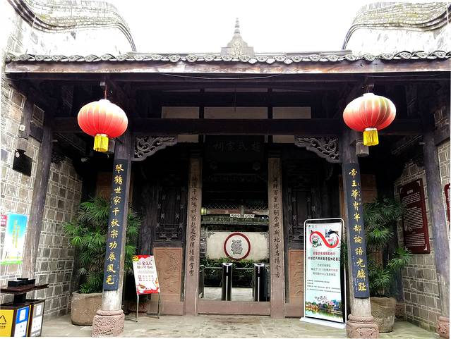 赵氏宗祠系赵氏族人填川至此一轮甲子后(1804年)建成,清光绪34年(1908年)重修。祠亦几经修葺,保留四进三重堂的规模。一重供族人聚会,子弟课读;二重供家族议事,严肃家规;三重供奉两宋十八帝君及祖宗灵位,以行祭祀隆典。祠堂建筑,抬梁穿斗,雕梁画栋,刻石描金;硬山屋顶,风火墙兜,青砖瓦屋,矫若飞鹰。此宗祠展现了清代移民之文化。