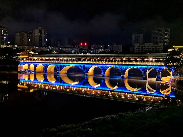 护城河上的彩虹桥,如果有专业设备的话,拍出来会更美。客栈旁边就是一座小镇,几盏路灯,一条青石路,格外幽静。