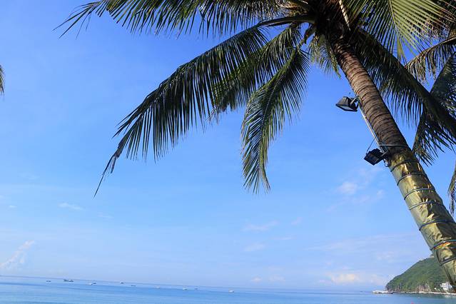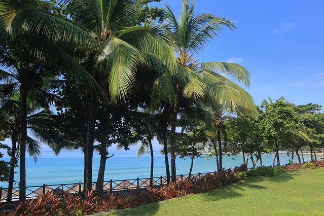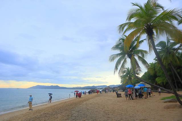 一排排翠绿椰林环抱沙滩,蓝天、碧海、青山、绿椰、白沙滩独特之美博得海内外游客的赞叹