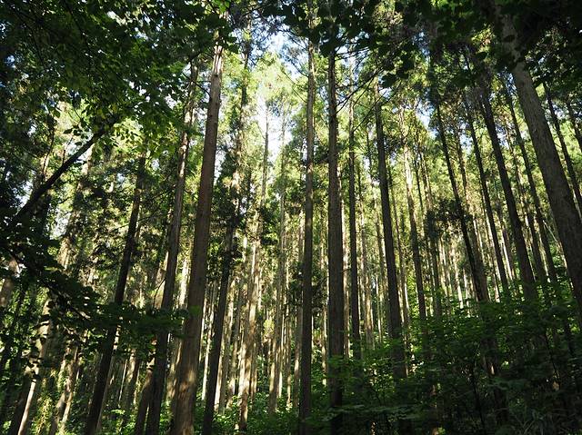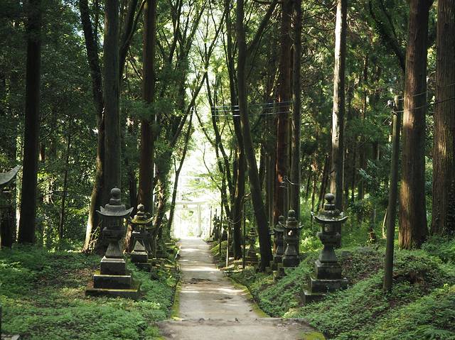 拾级而上走过牌坊,就会看到神秘的异世界。参道的左右两侧是郁郁葱葱的杉树林,更增添了几分幽深静谧,林中空气清新,令人神清气爽。